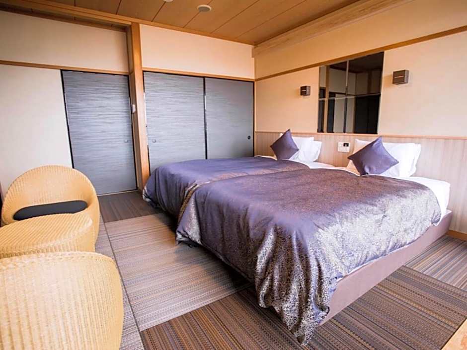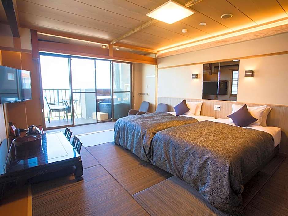 Guests will have a special experience as the twin room features a private open-air bath. Providing free toiletries and bathrobes, this twin room includes a private bathroom with a bath, a shower and a bidet. The spacious air-conditioned twin room provides a flat-screen TV, tatami, a wardrobe, an electric kettle as well as sea views. The unit offers 2 beds and 1 futon.